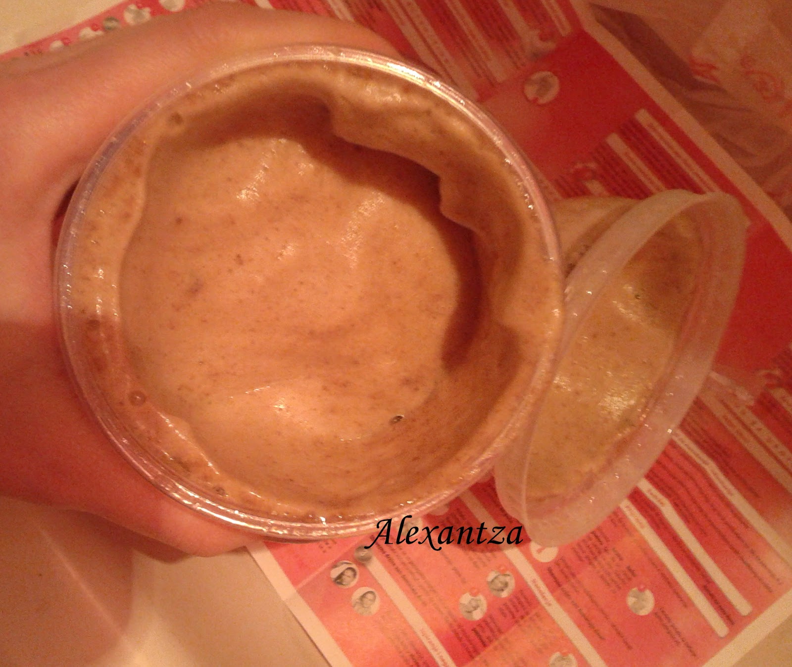 Sa incepem cu inceputul.. Am desfacut frumusel capacul paharului, am scos tot ce era in el si am citit instructiunile. Perfect! Am pus pudra coloranta si emulsia, am inchis capacul si am inceput sa-l agit cu putere. Aici a intervenit supriza: paharul meu stropea! :)) Cum s-a udat au inceput sa curga stropi pe langa, asa ca a fost nevoie sa lipsesc banda adeziva pe partea de jos a paharului si pe fundul acestuia. Toate bune si frumoase, mi-am continuat linistita activitatea de agitare a vopselei. Si la final am obtinut o spuma deasa, frumos colorata si cu un foarte usor miros de capsuni, tot ma deranja mirosul acela clasic al vopselei.