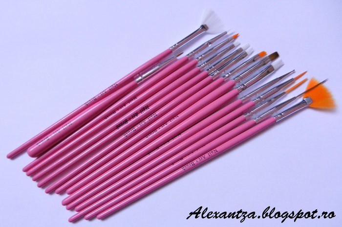 Si daca tot am o obsesie pasiune pentru oje si nail art, mi-am luat si un set de pensule. Evident, am cautat roz fiindca nu era pe mov. Alb era prea banal. :))